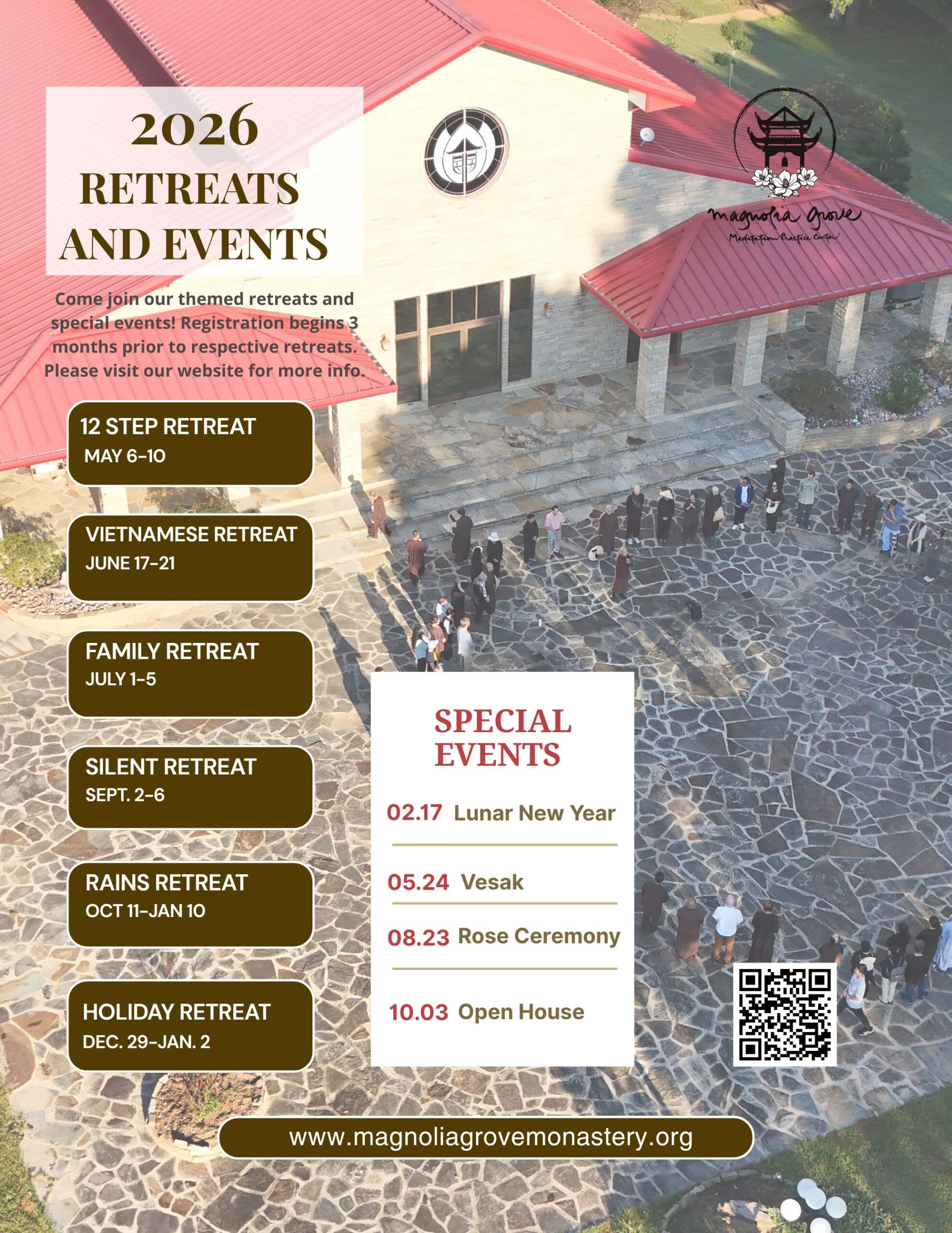 More specific info for each retreat is available closer to each retreat but generally the same information we provide here applies to all of our retreats: magnoliagrovemonastery.org/about-our-retreats/
